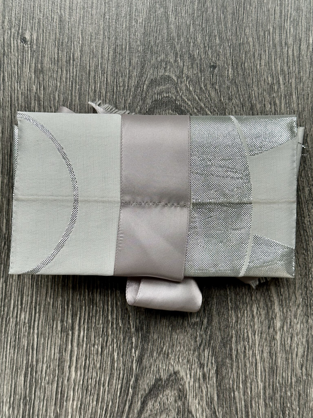 Petit étui en soie blanche et argent avec une doublure verte. La soie blanche a été récupère sur un obi vintage japonais (grosse ceinture de kimono) qui était un peu abîmé. Cette étui rembourrée protègera vos bijoux ou petite lunettes, lors de vos déplacements.