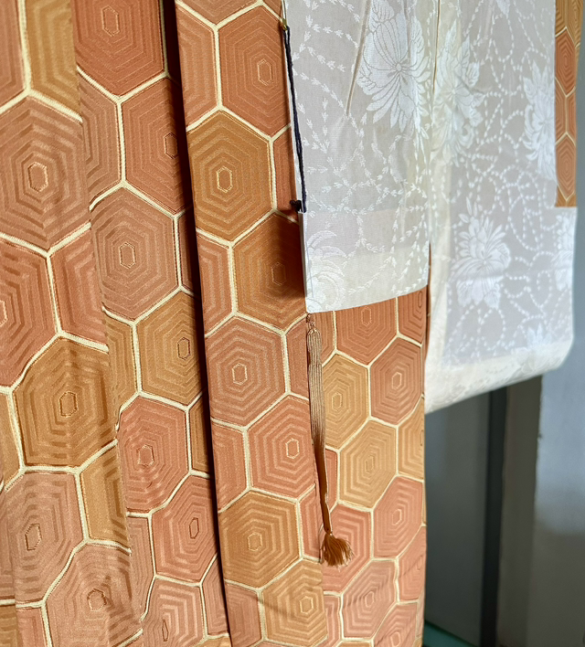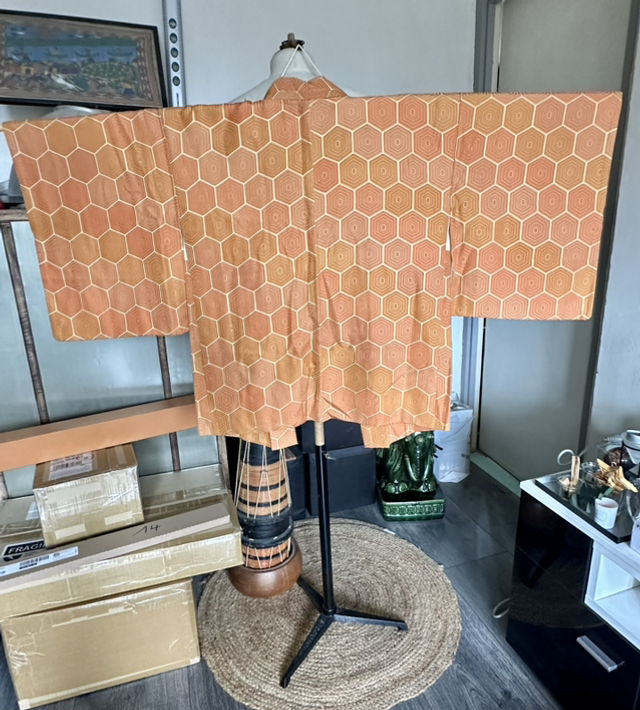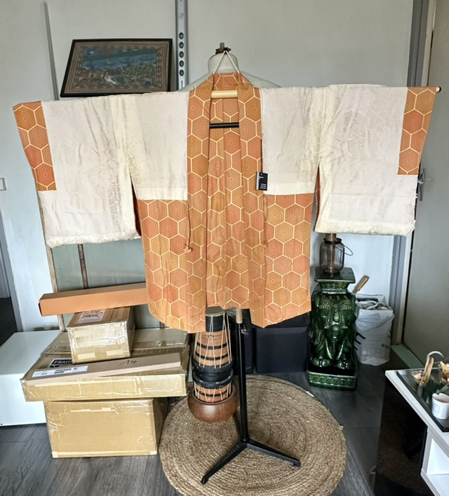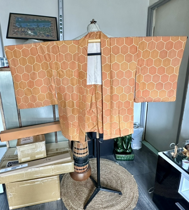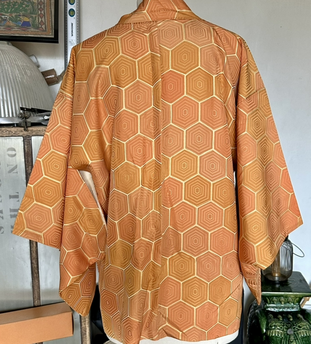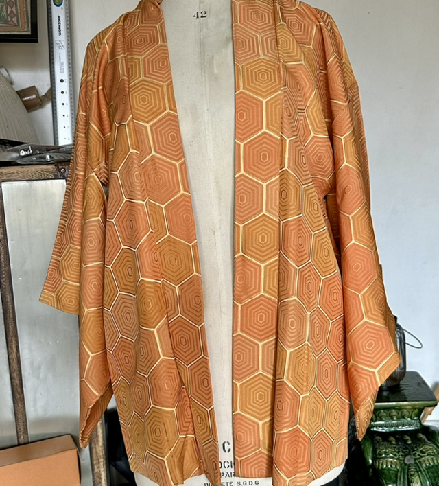 Belle veste, Haori en soie orange tissée d’octogones . La doublure en soie blanche est façonné de grosses fleurs. Il y a les attache himo Haori,normalement ça s’achète séparément. Si vous voulez en acheter vous en trouverez sur le site. Malgré son âge, cette pièce est en excellent état. Je rachète de vieux stock artisanaux au Japon et il peut y avoir quelques signes d’usures. Si il y en a, je le signal toujours en dernière photo. Toutes mes pièces sont daté des année 1930 à 1980.