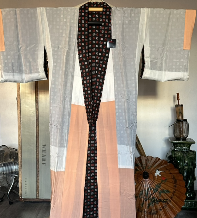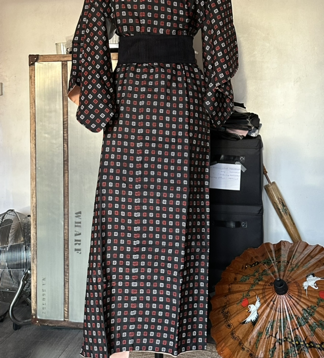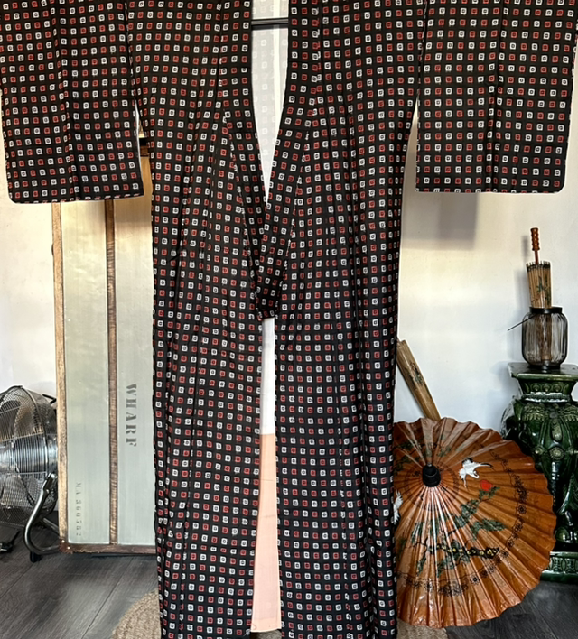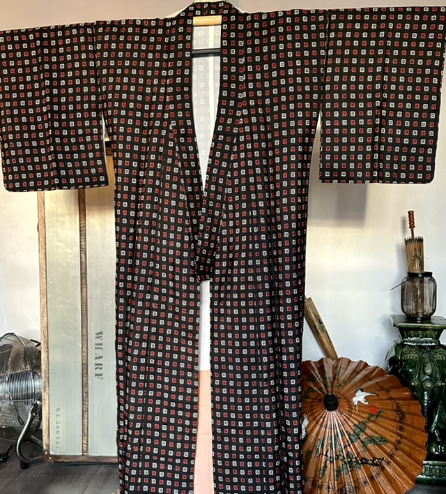 Kimono komon en soie légère noire avec des motifs carré rouge et blanc. La doublure est blanche et orange pale. C’est une pièce vintage japonaise. Ce kimono n’a jamais été porté, il y a les fils blanc de tenue a enlever. Les ceintures de kimono se vendent séparément. Vous en trouverez sur le site. Malgré son âge cette pièce est en très bon état. Je rachète d’anciens stock artisanaux au Japon et peuvent avoir quelques signes d’usure. S’il y a un défaut, je le signal toujours en dernière photo, Toutes mes pièces sont datés entre les années 1930 à 1980.