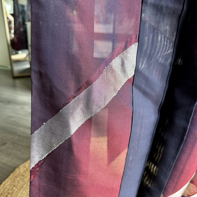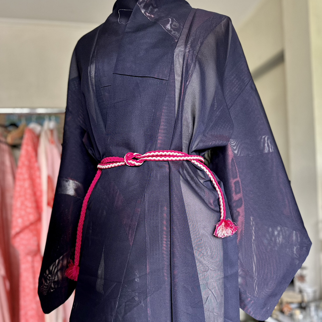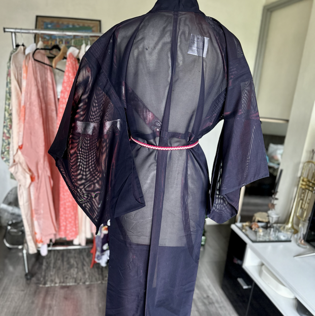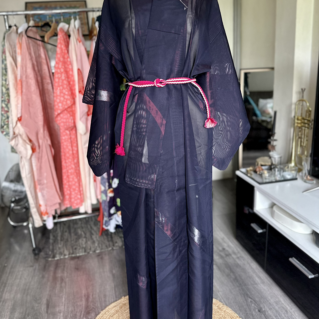 Kimono en organza de soie bleu marine à violet et l’intérieur rouge.Il y a des motifs tissés de ruban argenté,couleurs très subtiles. C’est une pièce vintage japonaise qui n’a jamais été porté. Il reste des fils de tenue blanc a enlevé. Malgré son âge cette pièce est en excellent état. Les ceintures de kimono se vendent séparément. Vous en trouverez sur le site. Je rachète de vieux stock artisanaux au Japon et peuvent avoir quelques signes d’usure. Je le signal toujours en dernière photo. Toutes mes pièces sont daté des année 1930 à 1980.
