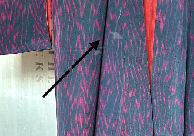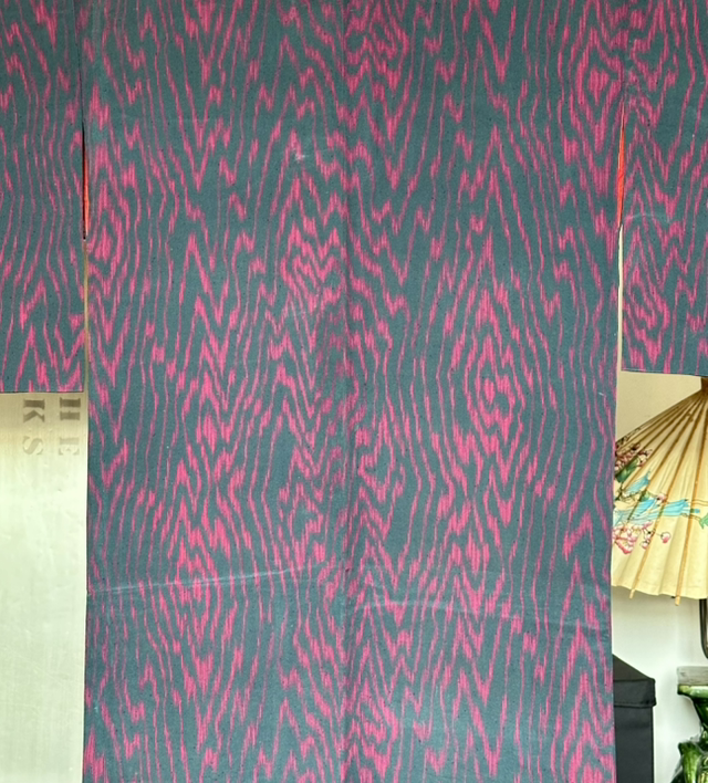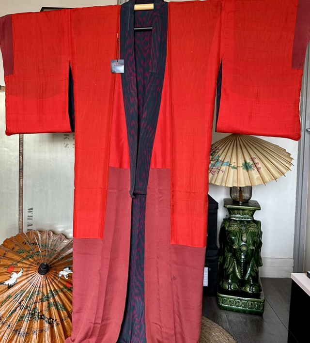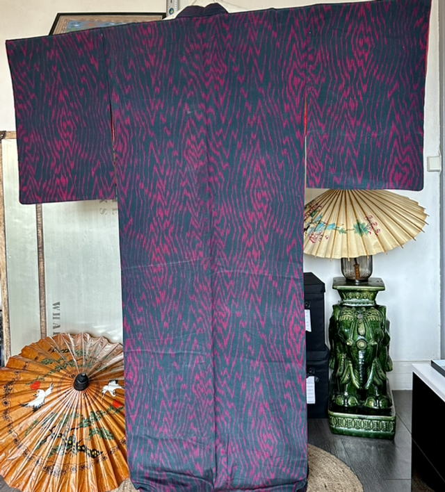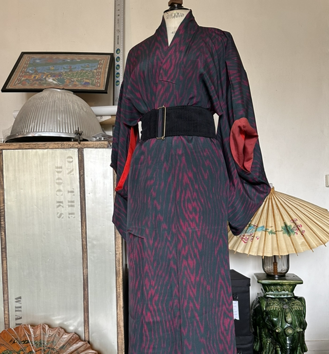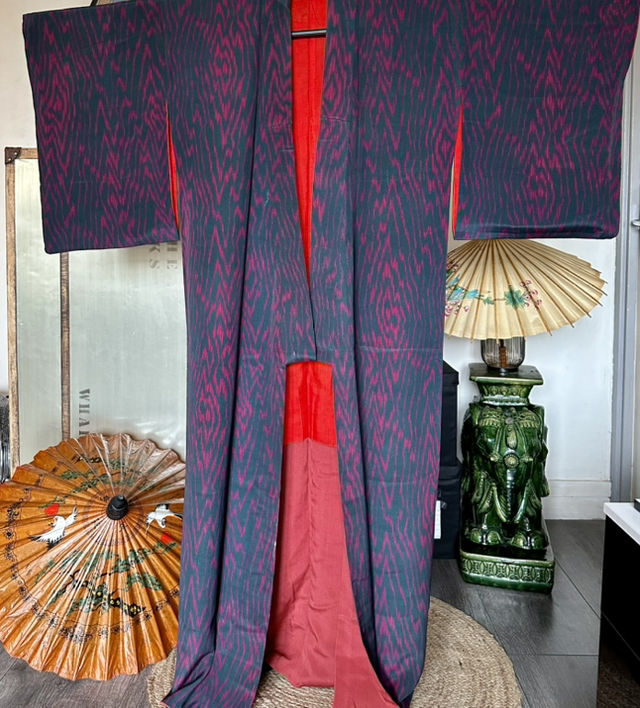 Kimono en soie légére vert foncé et des motifs abstrait fuschia. Il y a une doublure rouge vif et bordeaux. C’est une pièce vintage japonaise qui a deux petites taches dhumidité, devant à droite ( une fois porté croisé, les taches ne sont pas visible. Malgré son âge cette pièce est en très bon état. Je rachète d’anciens stock artisanaux au Japon et peuvent avoir quelques signes d’usure. S’il y a un défaut, je le signal toujours en dernière photo, Toutes mes pièces sont datés entre les années 1930 à 1980.