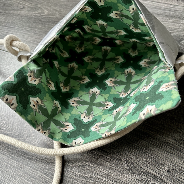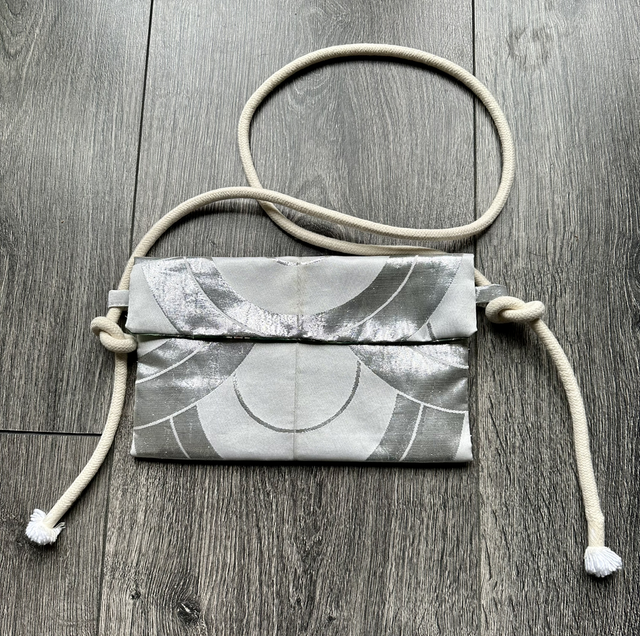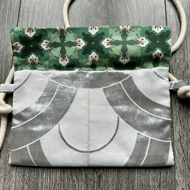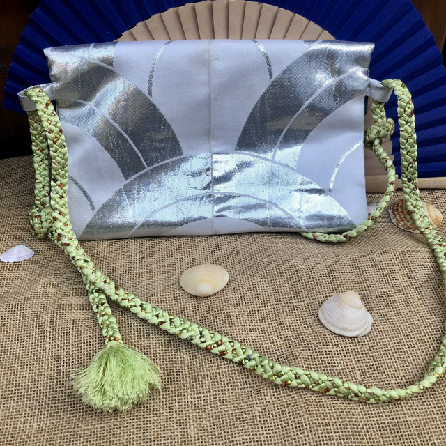 Sac en soie blanche et argent avec une doublure coton verte. La soie blanche a été récupère sur un obi vintage japonais (grosse ceinture de kimono) qui était un peu abîmé. Ce sac est rembourrée. Je vous propose deux versions : une avec une corde simple blanche pour la anse ou la ceinture obijime en soie verte. Je ferai une réduction si vous achetez la version avec la ceinture obijime. Contactez-moi