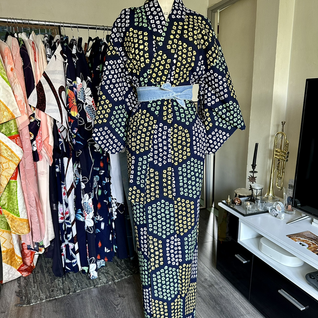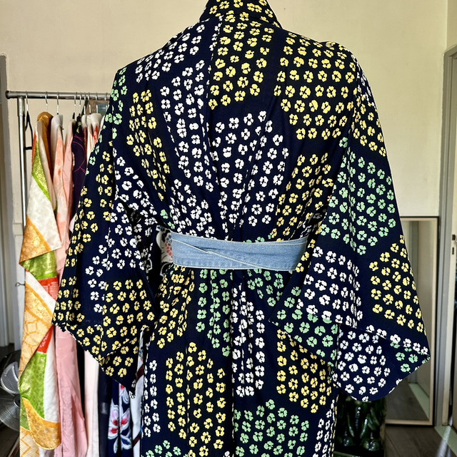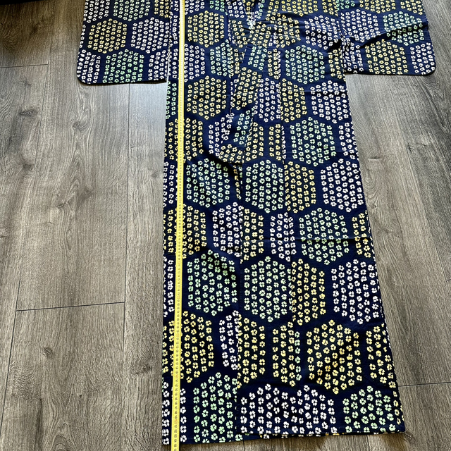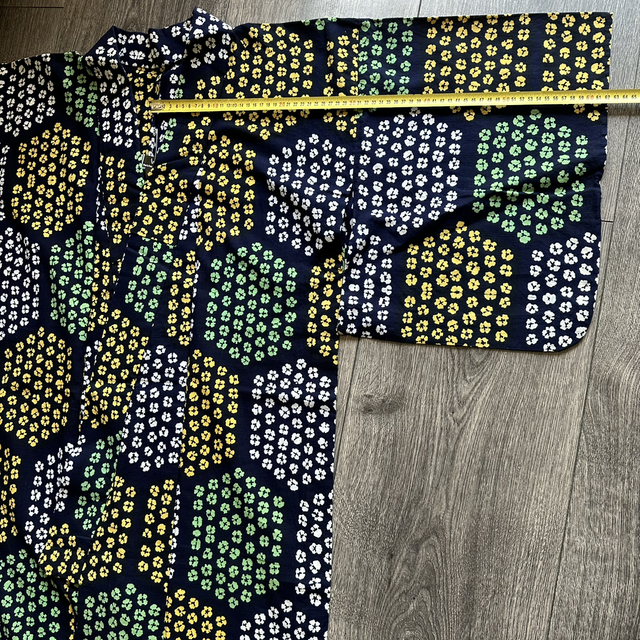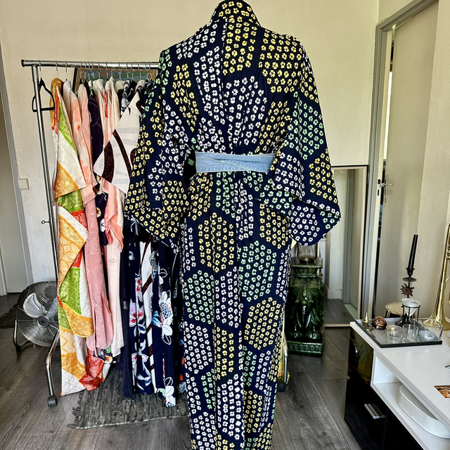 Kimono Yukata en coton bleu marine avec des motifs de petites fleurs qui forment des octogone, de couleurs jaunes , bleu , blanc. C’est une pièce vintage japonaise. Malgré son âge, cette pièce est en excellent état. Je rachète de vieux stock artisanaux au Japon et peuvent avoir quelque signe d’usure. Si il y en a, je le signal toujours en dernière photo. Toutes mes pièces sont daté des année 1930 à 1980.